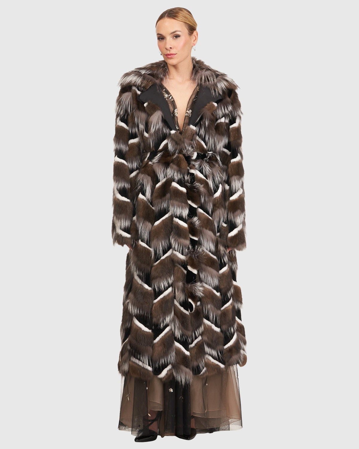 Sable, Mink and Fox Intarsia Coat with Belt Gorski First Copy - Barguzine/Black/White/Silver / XS